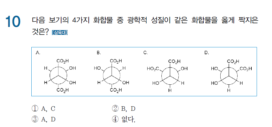 B, D는 동일한 분자로 메조화합물입니다. 광회회전도가 0이 됩니다.